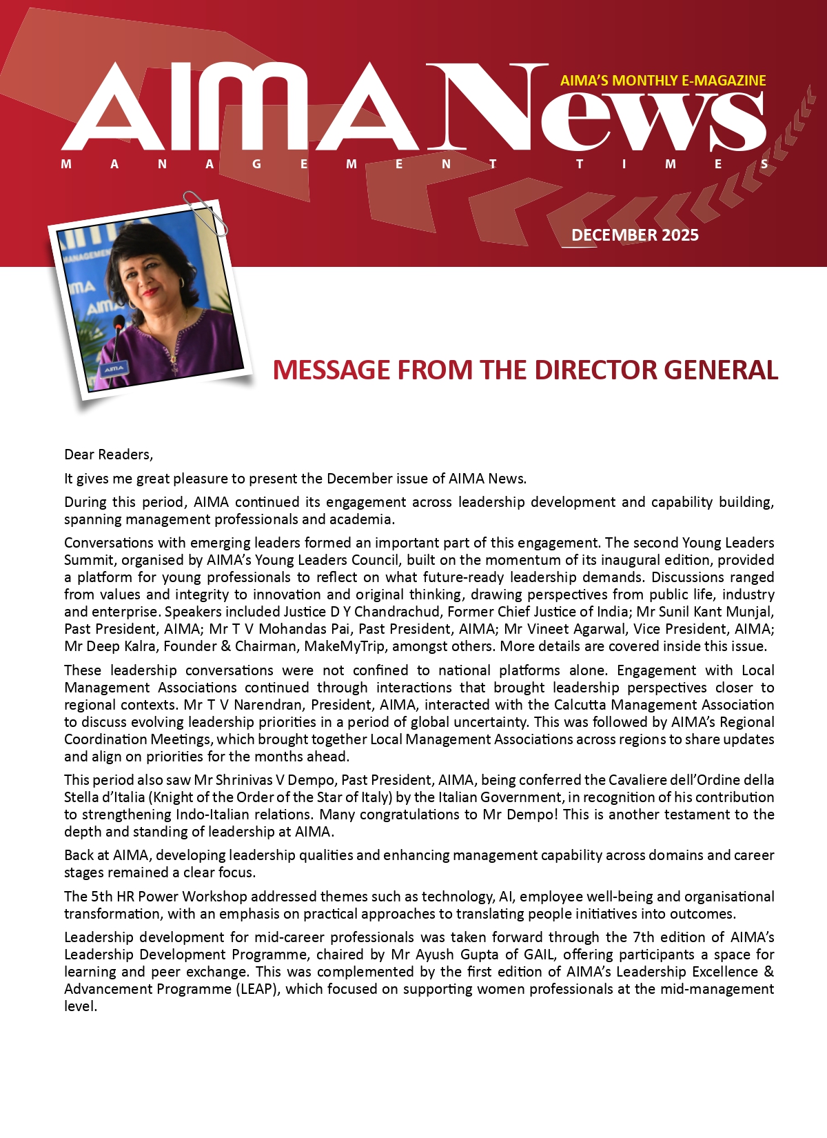 AIMA News is published monthly and covers reports on various national events, programmes, seminars and workshops conducted by AIMA and the LMAs. It includes information on forthcoming programmes and events.